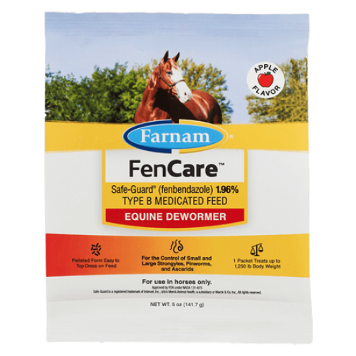 Farnam FenCare Safe-Guard  (fenbendazole) 1.96% TYPE B Medicated Feed Equine Dewormer contains 1.96% fenbendazole for the control of key equine parasites including large strongyles, small strongyles, pinworms and ascarids in horses. Concentrated formula with the same dosage as leading competitors, but with a smaller feeding rate.
