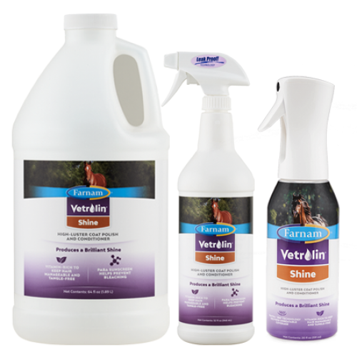 Enhance your grooming experience and impart a long-lasting, healthy sheen to your horse's coat, mane and tail with Vetrolin Shine. This trusted favorite adds a brilliant shine and repels stains, keeping your horse looking his best.